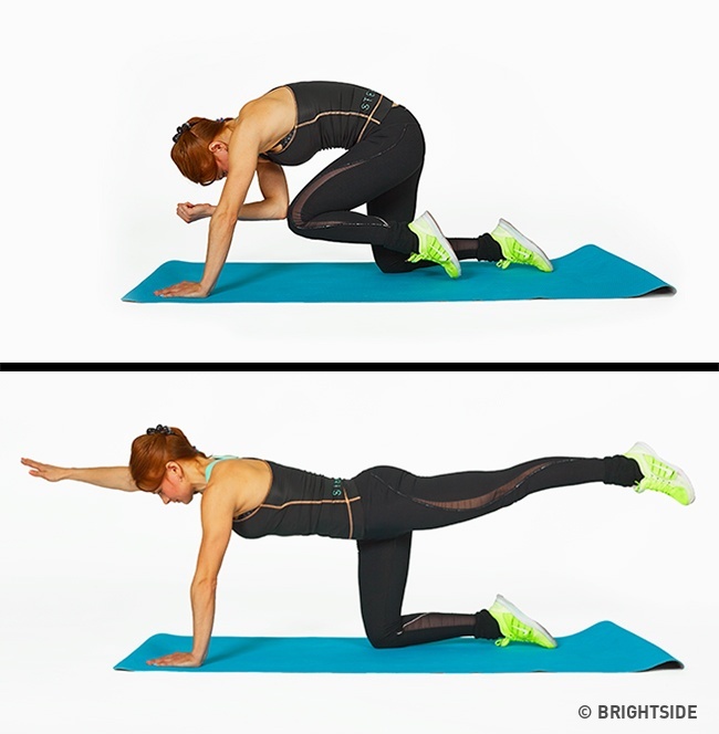 Należy ustawić się na czworakach i wyciągnąć prawą rękę do przodu, a lewą nogę do tyłu – tak, aby utworzyły prostą linię. Później trzeba powoli je zgiąć i dążyć do dotknięcia się łokcia z kolanem.