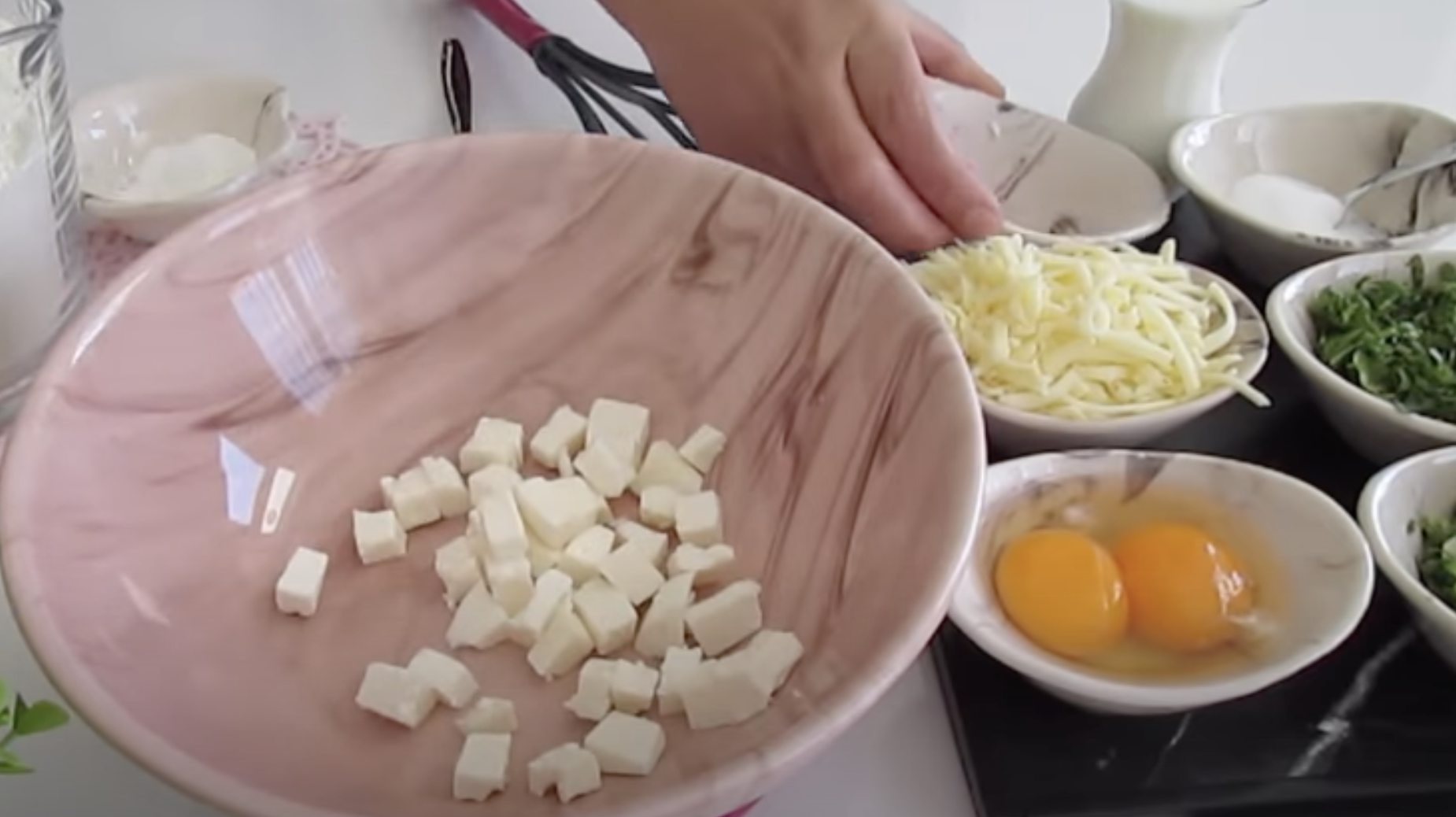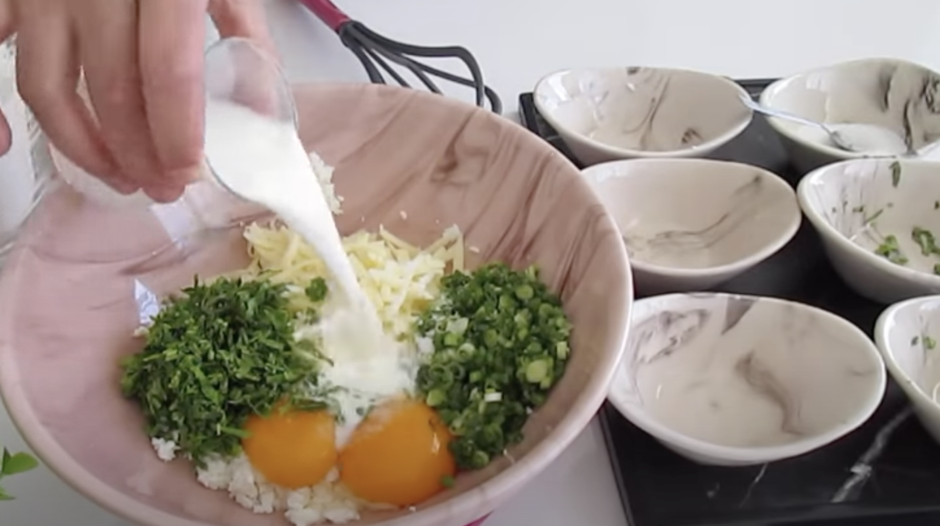 W dużej misce połącz starty ser bałkański, jajka, mleko i posiekane zioła. Do zmieszanych składników dodać mąkę i proszek do pieczenia.