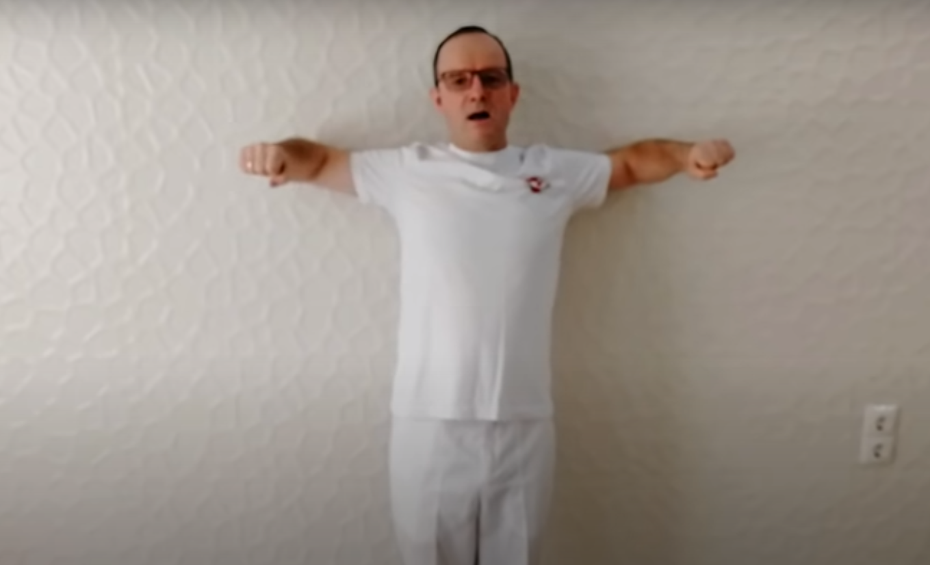 Ćwiczenie pierwsze wygląda następująco: stajemy tyłem pod ścianą, tak, aby zachować od niej dystans małego kroku. Ramiona oraz łopatki opieramy o ścianę, a dłonie układamy pod kątem prostym (ciało i dłonie mają tworzyć taki kąt względem siebie). Miarowo przy tym oddychamy, a w momencie wydechu łokcie wpychamy w ścianę. Ćwiczenie należy powtórzyć ok 20 razy.