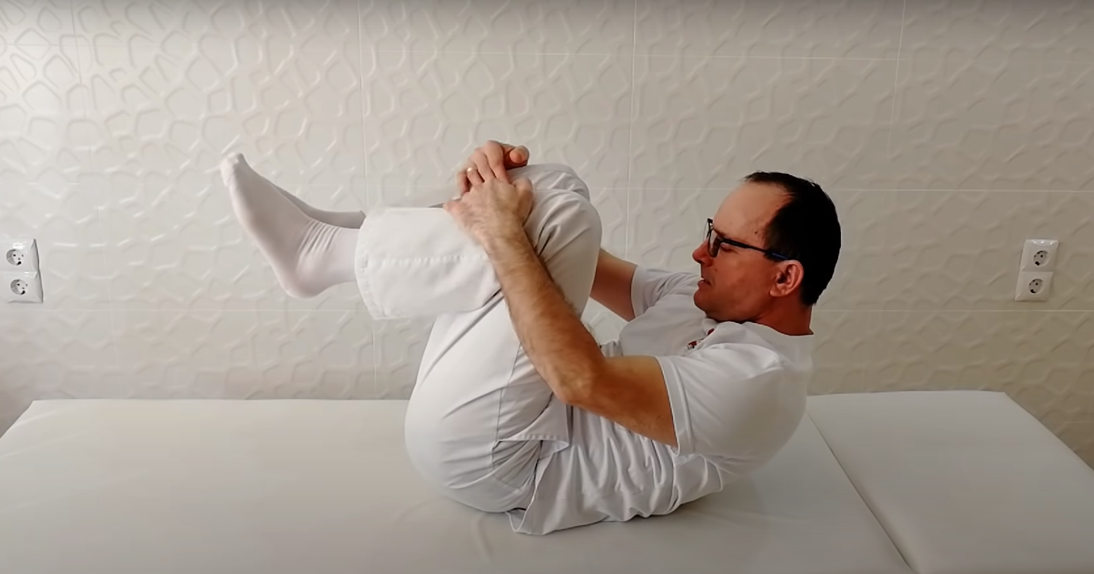 Ostatnie z ćwiczeń polega na położeniu się na plecach i rozłożeniu ramion, a następnie na podciągnięciu ich do klatki piersiowej. Można powiedzieć, że przytulamy kolana do klatki. Powtarzamy tę czynność 15-20 razy. Jak wcześniej zwracamy uwagę na oddech, każde powtórzenie wykonując przy wydechu.