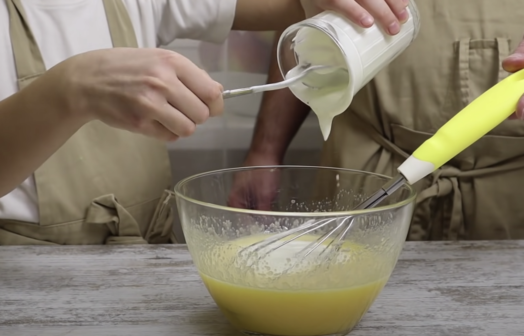Żółtka wymieszać z cukrem i cukrem waniliowym. Wymieszać z jogurtem.