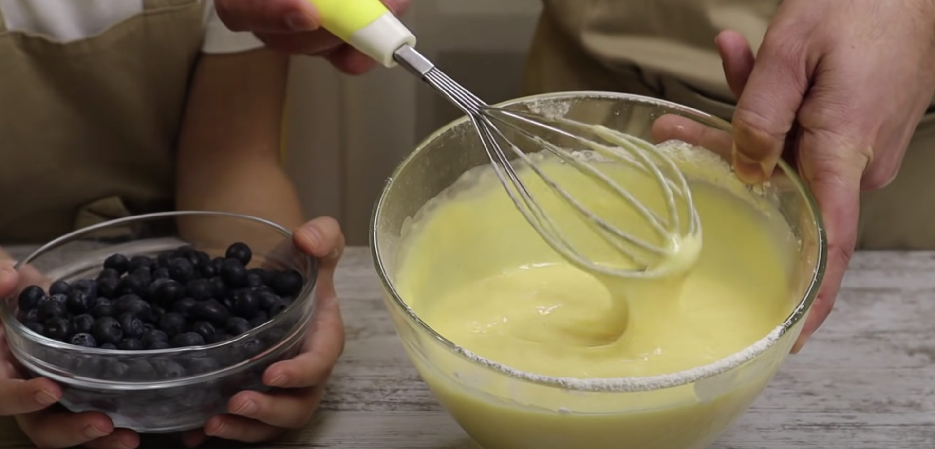 Do masy dodać przesianą mąkę i proszek do pieczenia. Wymieszaj składniki, aż uzyskasz jednolite ciasto.