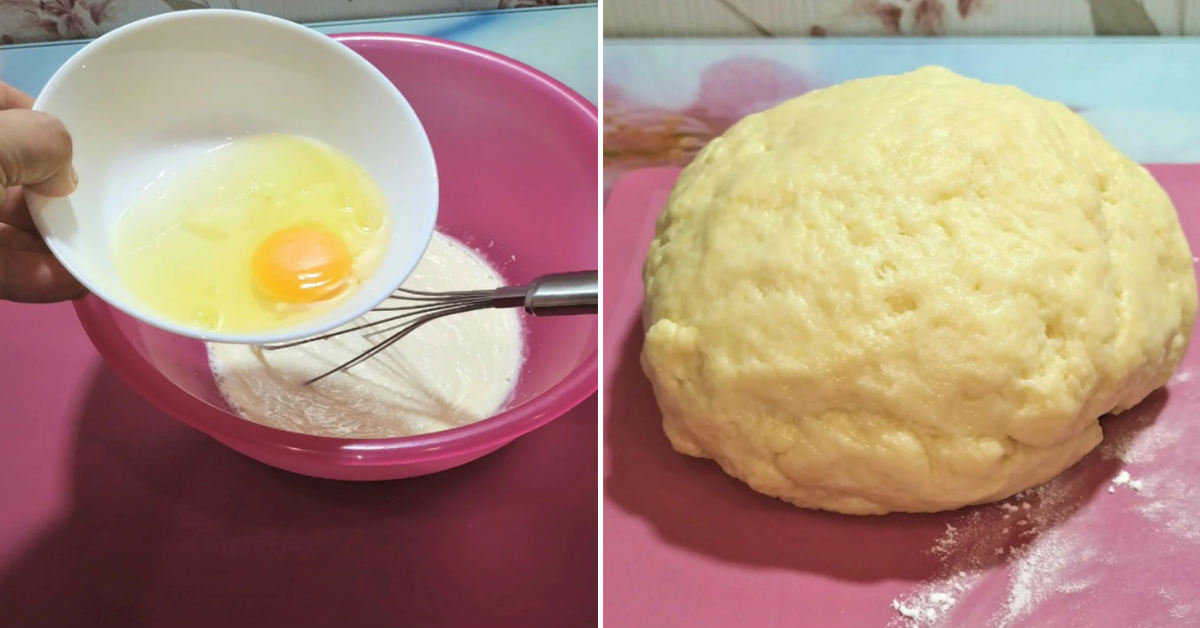 Aby zacząć wymieszaj razem ze sobą cukier, sól, kefir i ocet za pomocą trzepaczki. Do tego dodaj 1 żółtko i 2 białka. Nie zapomnij oczywiscie o proszku do pieczenia. Do miski przesiej mąke, a podczas tego nie zapominaj o ugniatania całości ciasta.