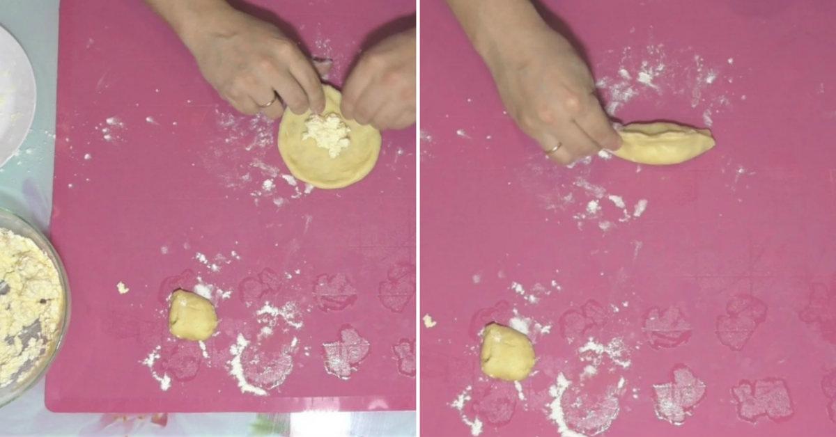 Weź jeden kawałek ciasta i posyp dokładnie z każdej strony mąką, następnie go rozgniec, aby uzyskać mały kawałek. Na sam środek dodaj nadzienia i złacz razem wszystkie rogi ciasta, a następnie zrób to z każdym kawałkiem.