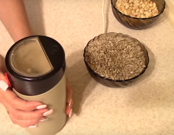 Nasiona słonecznika bez łupinki mielimy w młynku do kawy lub jak kto woli w blenderze. Podobnie postępujemy z orzechami arachidowymi.