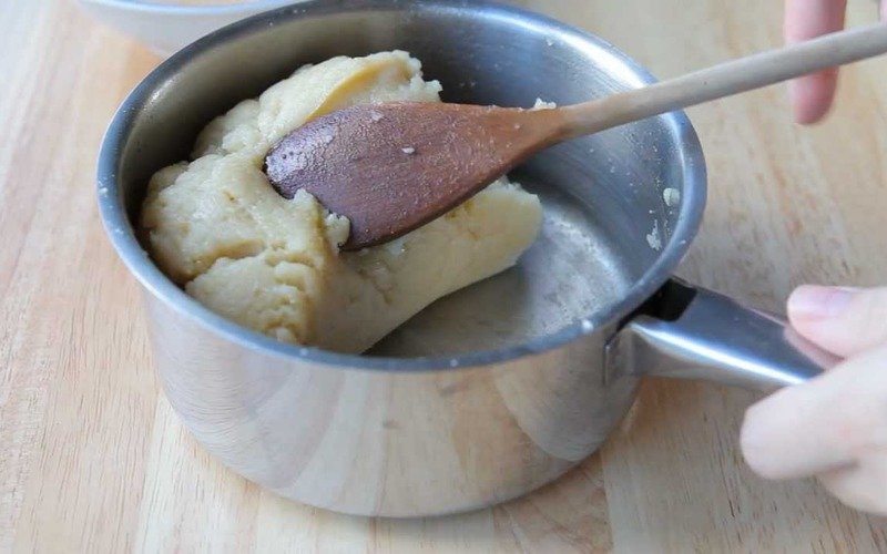 Połowę wody zagotuj z masłem na wolnym ogniu. Przesiej mąkę i stopniowo dodawaj do wody z masłem. Ciągle mieszając drewnianą szpatułką uzyskasz gładkie ciasto. Wyłącz ogień i do masy dodaj jajka – stopniowo i ciągle mieszaj szpatułką.