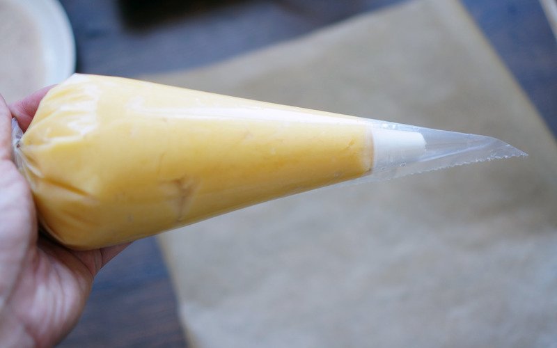 Przygotowaną masę przełóż do szprycy cukierniczej. Do osobnego garnka lub patelni wlej olej i rozgrzej go tak jak na frytki.