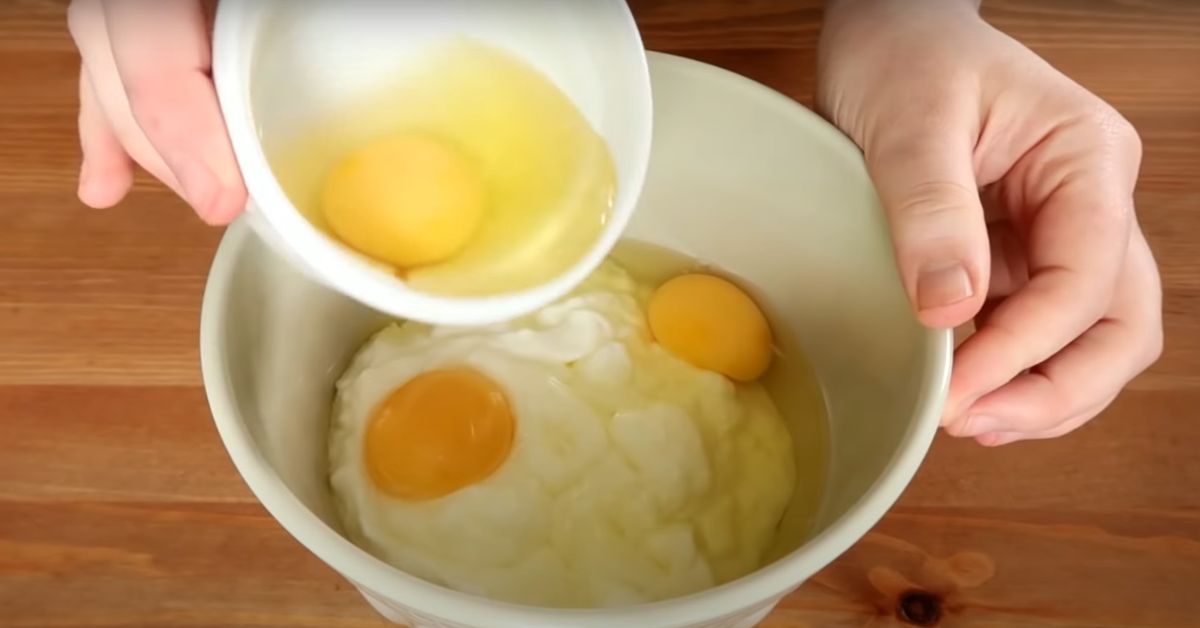 Tak jak wspominałam – przygotowanie tego ciasta jest banalnie proste. Najpierw wlewamy jogurt do dużej miski i dodajemy do niego jajka. Składniki ubijamy na gładką masę. Na koniec dodajemy przesianą mąkę kukurydzianą.