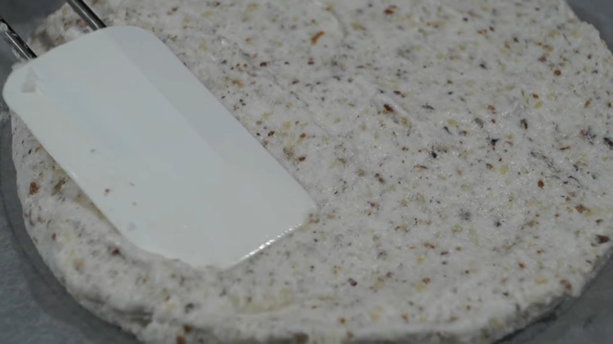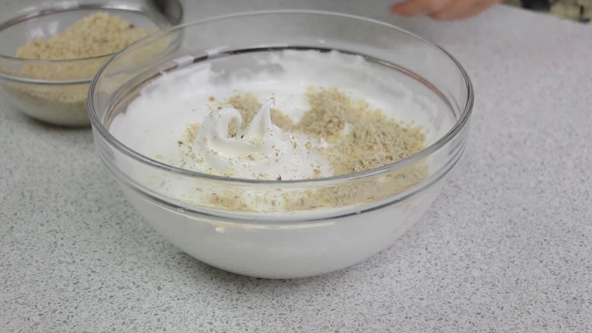 Białka ubij na sztywną pianę, a następnie dodaj cukier i dalej miksuj. Następnie stopniowo dodawaj mąkę i orzechy, delikatnie mieszaj do powstania jednolitej konsystencji.
