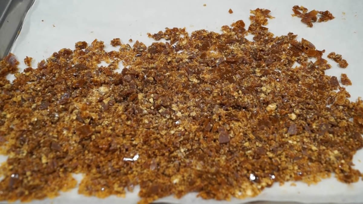 W garnuszku rozpuść pozostały cukier i delikatnie go skarmelizuj. Natychmiast wylej go na przygotowany wcześniej pergamin i nakryj drugim pergaminem. Cukier zmiażdż za pomocą wałka na mniejsze kawałki. Tak by uzyskać małe chrupiące kawałki.