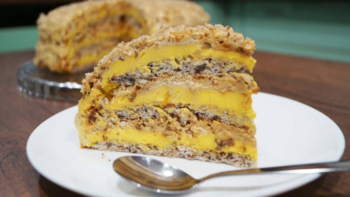 Rozłóż na każdym spodzie ciasta po 1/3 kremu, na wierzch zwykłego kremu, nałóż warstwę kremu z karmelizowanym cukrem i orzechami. Tą czynność powtórz na każdym blacie ciasta. Możesz udekorować ciasto orzechami.