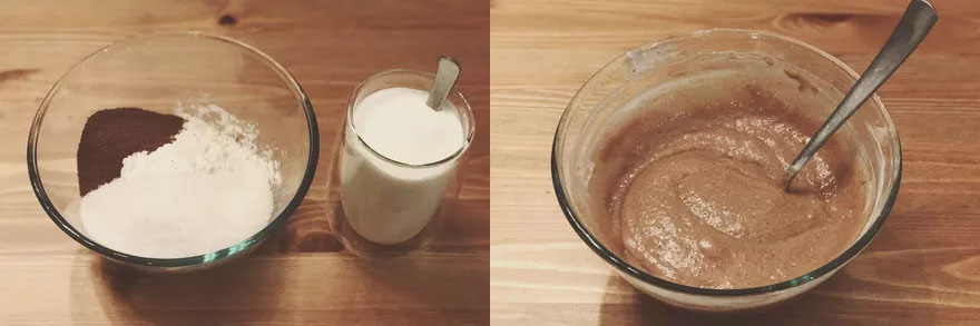 W naczyniu umieszczamy cukier, kakao, mąkę pszenną i ewentualnie jajka (nie są one konieczne, jeśli nie masz ich w lodówce ciasto wyjdzie równie pyszne!). Następnie mieszamy, aż do ich dokładnego połączenia. Do osobnej miseczki wlewamy kefir lub maślankę i wsypujemy sodę oczyszczoną.