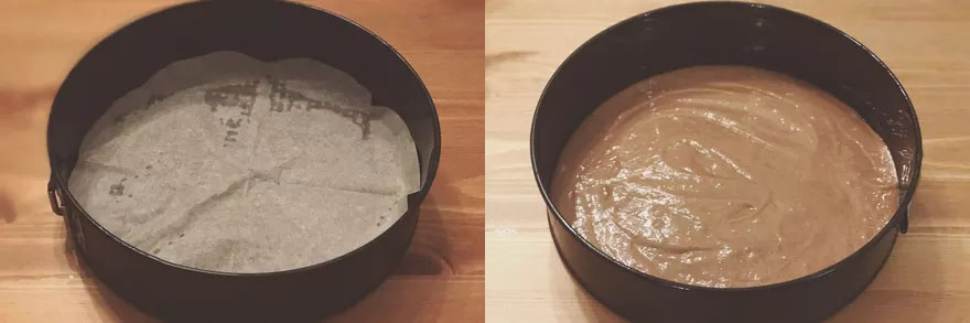 Należy dobrze je razem wymieszać, Zawartość obu naczyń łączymy, aż do powstania gładkiej, czekoladowej masy. Tortownicę o średnicy 26 centymetrów wysmaruj dowolnym tłuszczem, a następnie wyłóż papierem do pieczenia. Do przygotowanej w ten sposób formy, przelej przygotowane ciasto.