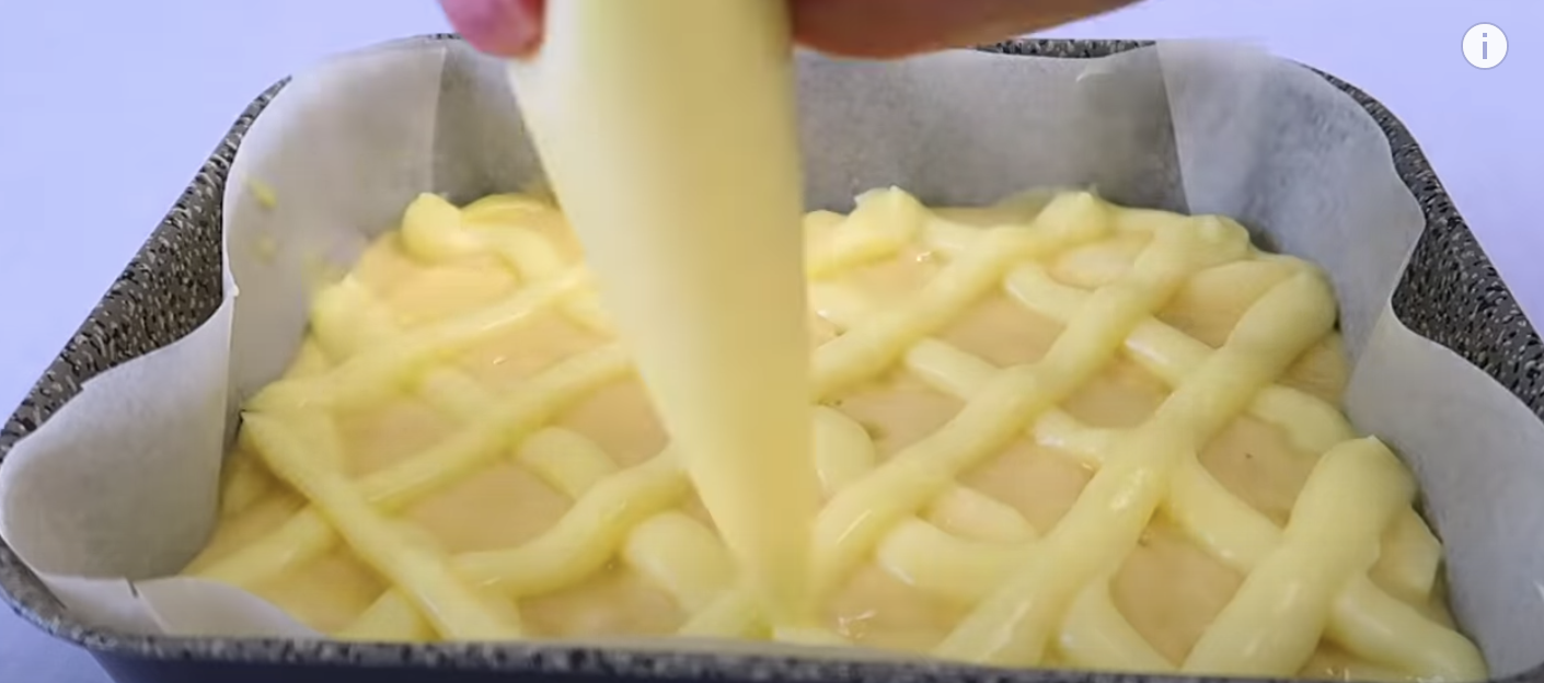 Następnie przygotować ciasto – utrzeć białka jaj z cukrami, dodać żółtka. Do masy dodać przesianą mąkę z proszkiem do pieczenia. Wylać na formę do pieczenia. Obrane i pokrojone jabłka umieścić na surowe ciasto. Następnie przełożyć krem budyniowy w dowolnym kształcie.