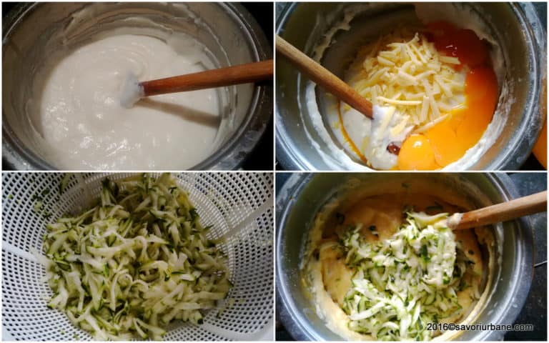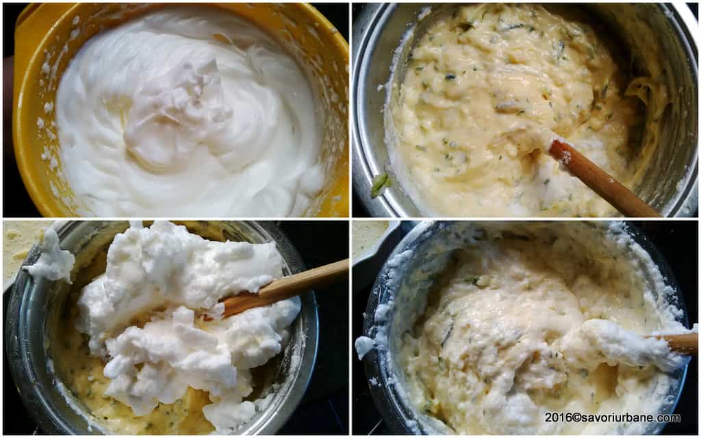 Do ostudzonego białego sosu dodaj 4 żółtka oraz twardy, starty ser. Cukinię ściśnij w dłoniach, aby pozbyć się nadmiaru wody, dodaj ją do sosu, całość dopraw białym pieprzem. Białka umieść w misce, dodaj szczyptę soli i ubij na sztywną pianę. Dodawaj po łyżce do warzywnej mieszanki i delikatnie mieszaj.