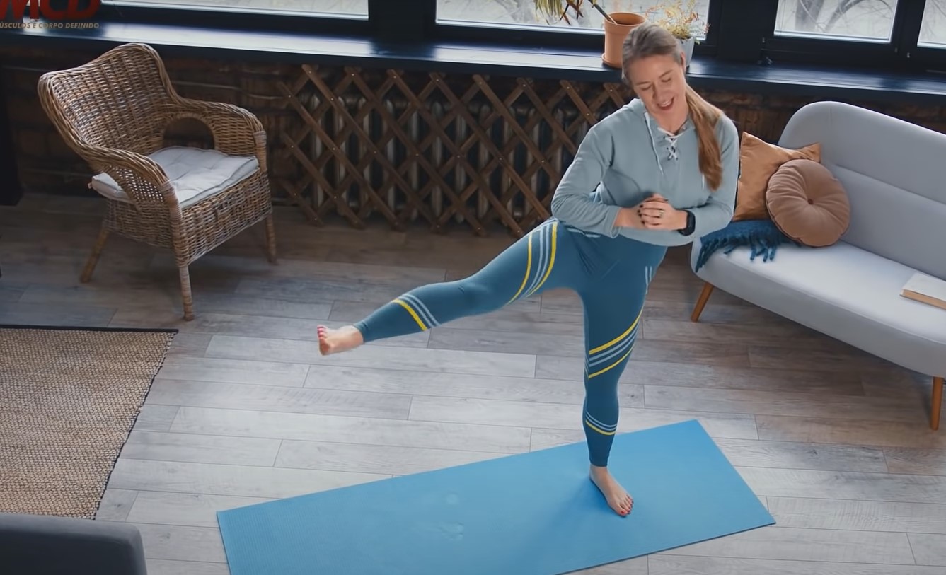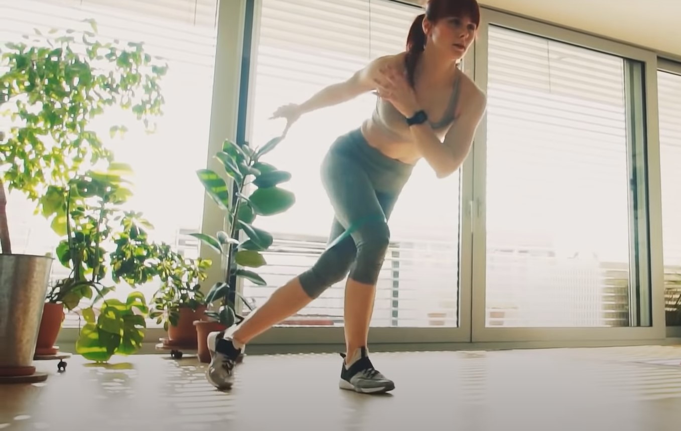 Ćwiczenie należy wykonywać przez 30 sekund. Najlepiej będzie jak użyjesz gum fitness, które nakłada się na biodra. Przeskakuj z nogi na nogę, tak aby się krzyżowały. Przy tym zawsze dotykaj z przodu przeciwległego ramienia ręką. Plecy maja być proste, lekko pochylone do przodu, mięśnie napięte, a ciało jędrne.
