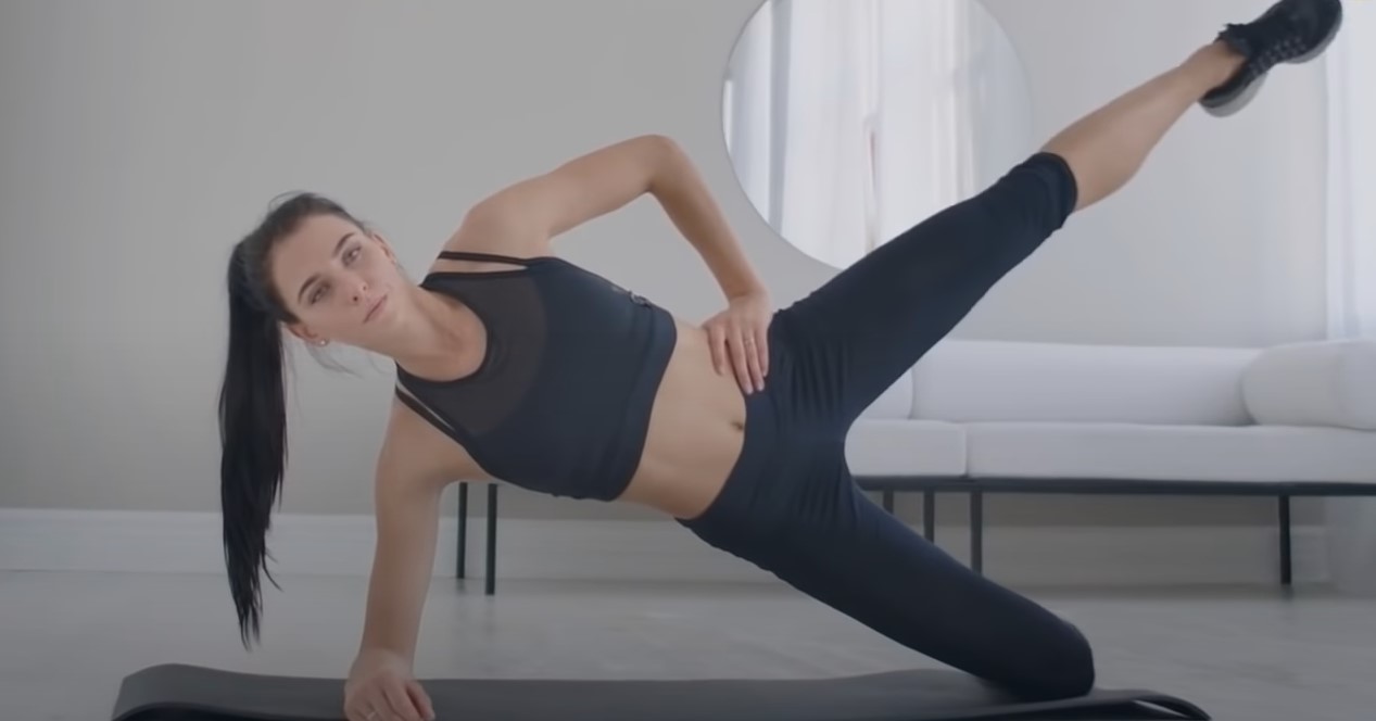 W pozycji bocznej oprzyj się kolanie jednej nogi i na łokciu. Drugą rękę trzymaj w pasie. Podnieś wyciągniętą drugą nogę tak wysoko, jak dasz radę. Ćwiczenie powtarzaj przez 30 sekund z każdej strony.