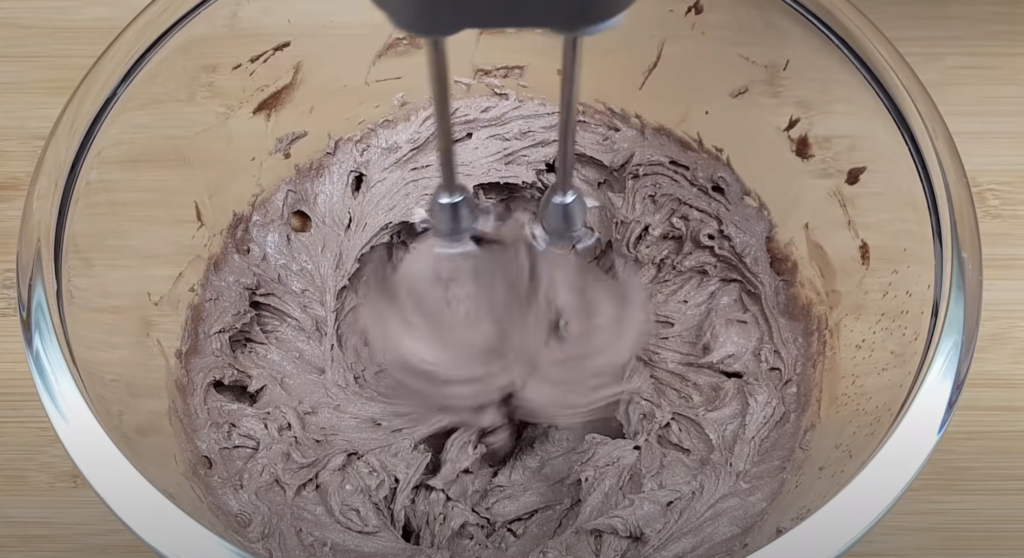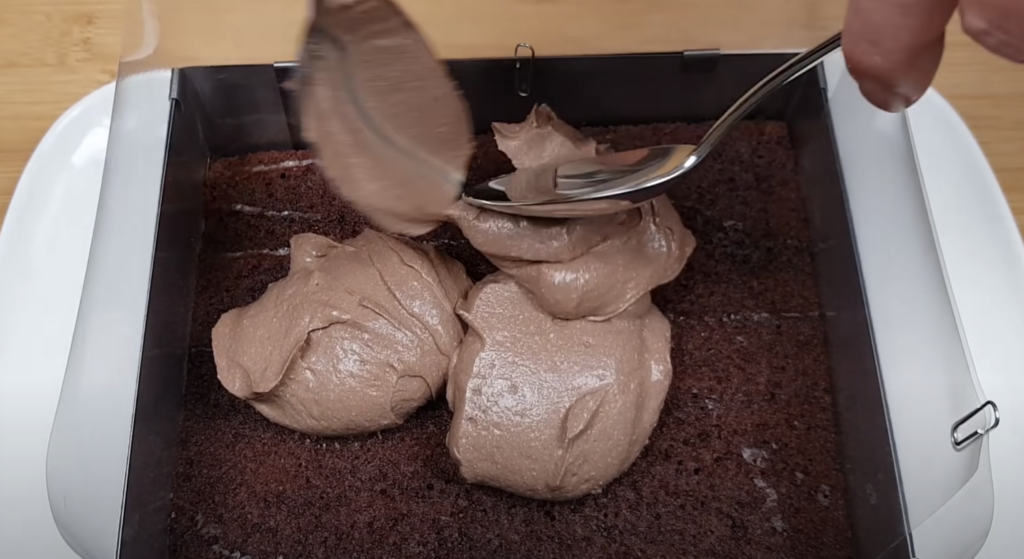 Rozpocznij przygotowywać krem. Wymieszaj ze sobą twarożek, mleko skondensowane, śmietanę i kakao. Teraz pora połączyć ciasto w całość. Na początek ułóż pierwszą część ciasta na mniejszej blasze i rozprowadź na nim 1/3 kremu.