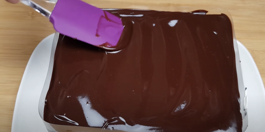 Dodaj do gorącej mieszanki połamaną czekoladę i energicznie mieszaj, aż czekolada całkowicie się rozpuści. Polej nią równomiernie wypiek i poczekaj aż polewa stwardnieje. Po tym czasie możesz pokroić ciasto na kawałki i podawać.