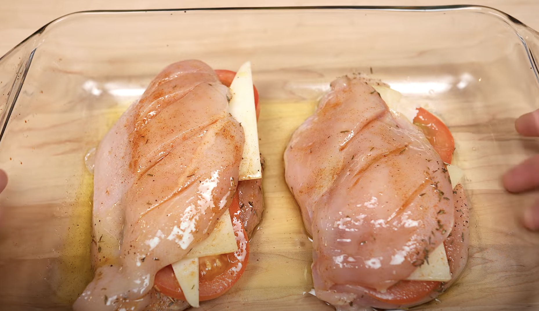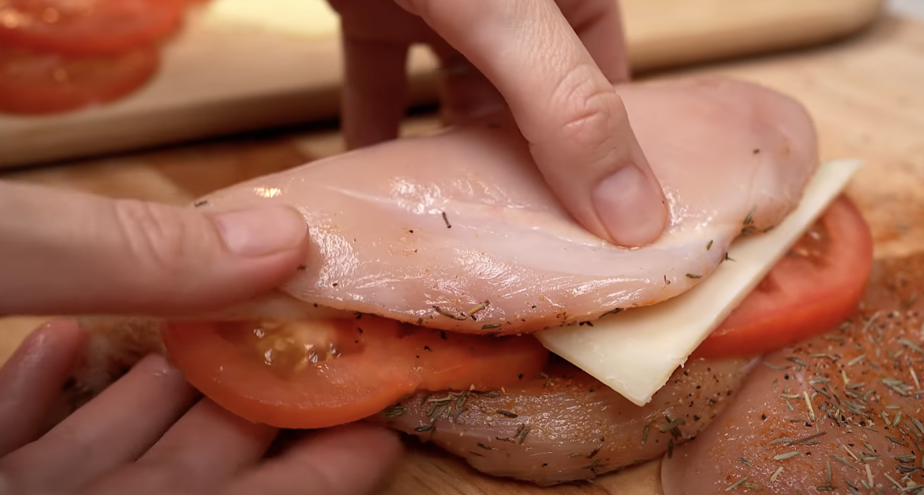 Na każdej piersi należy położyć po dwa plasterki pomidora i sera. Następnie złożyć mięso jak kartkę papieru. Piersi układamy na blasze posmarowanej olejem, robiąc trzy nacięcia na górze. Mieszankę musztardową posolić i rozsmarować na mięsie.