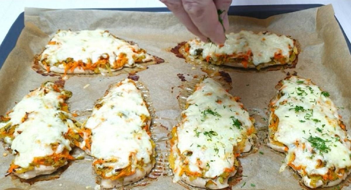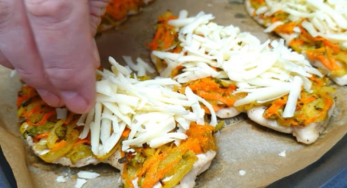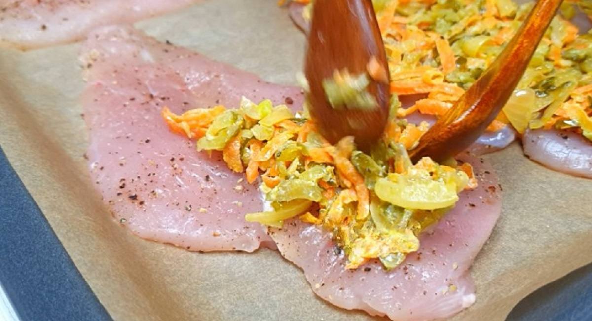 Na wcześniej przygotowane porcje kurczaka nałóż gotową mieszankę warzywną. Nastaw piekarnik na 200 stopni i włóż do niego gotową blachę na kwadrans.