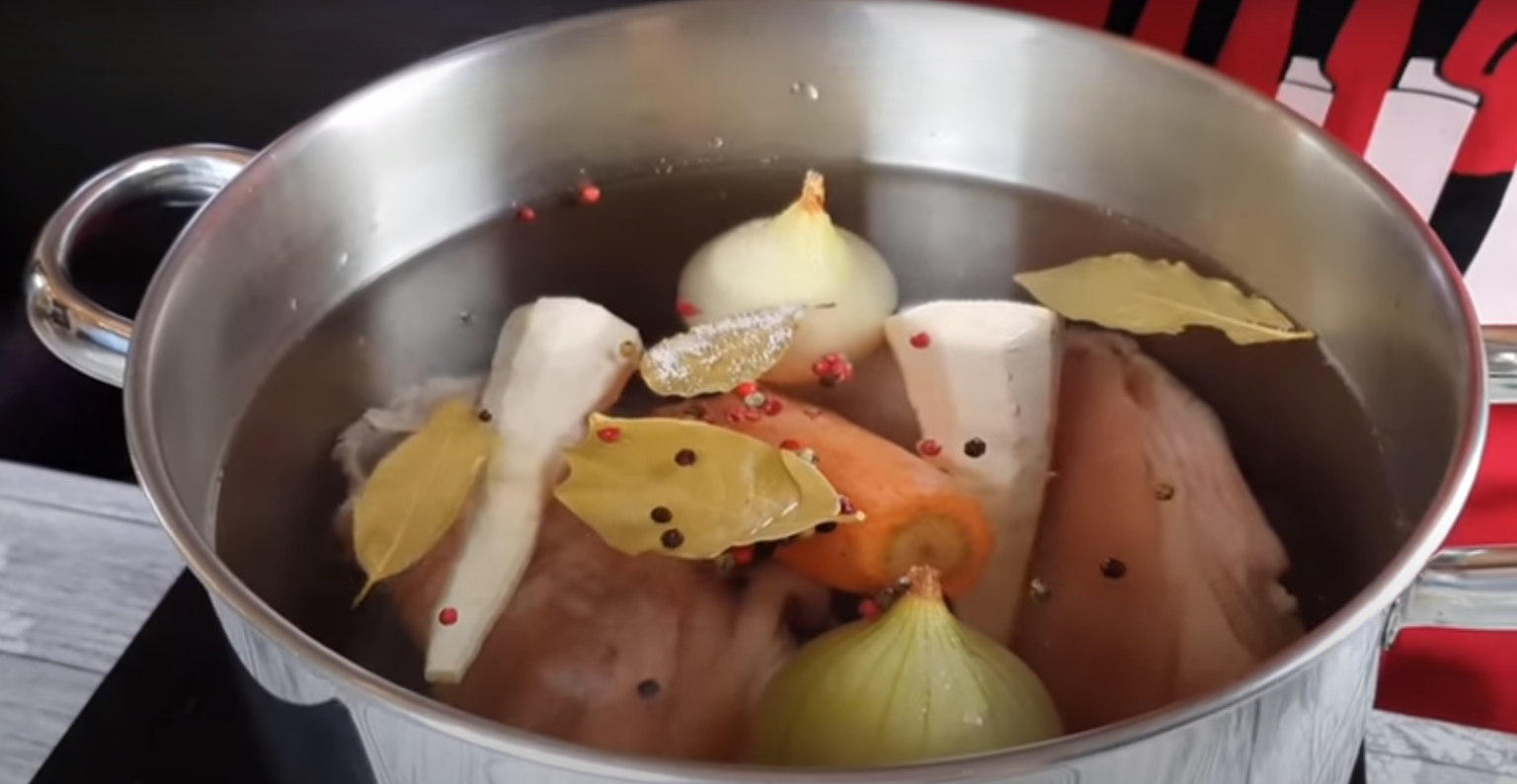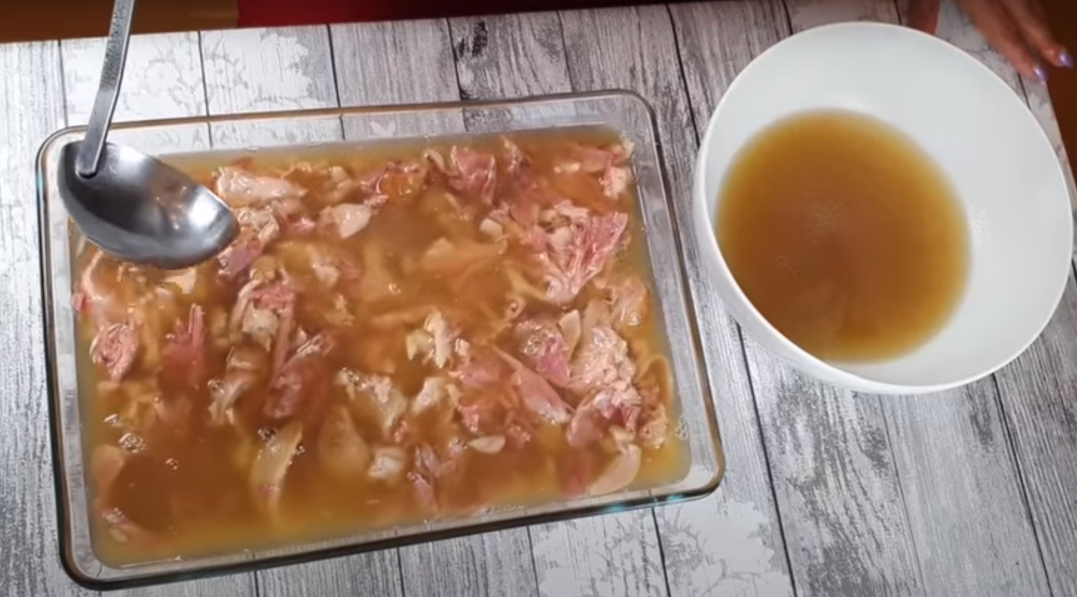 Dodaj pokrojone mięso i zalej całość bulionem. Powstałe danie wstaw do lodówki na całą noc, by mogło stężeć.