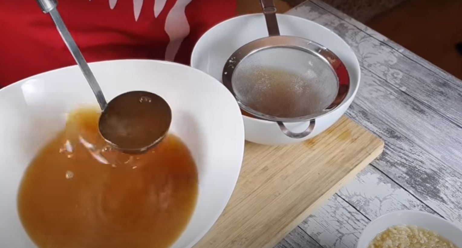 Następnie przygotuj czosnek. Dokładnie oczyść ząbki i przeciśnij je przez praskę. Przełóż go do miseczki i zalej około dwoma szklankami bulionu. Po upływie 5 minut przecedź dokładnie przez drobne sito powstały wywar oraz resztę bulionu.