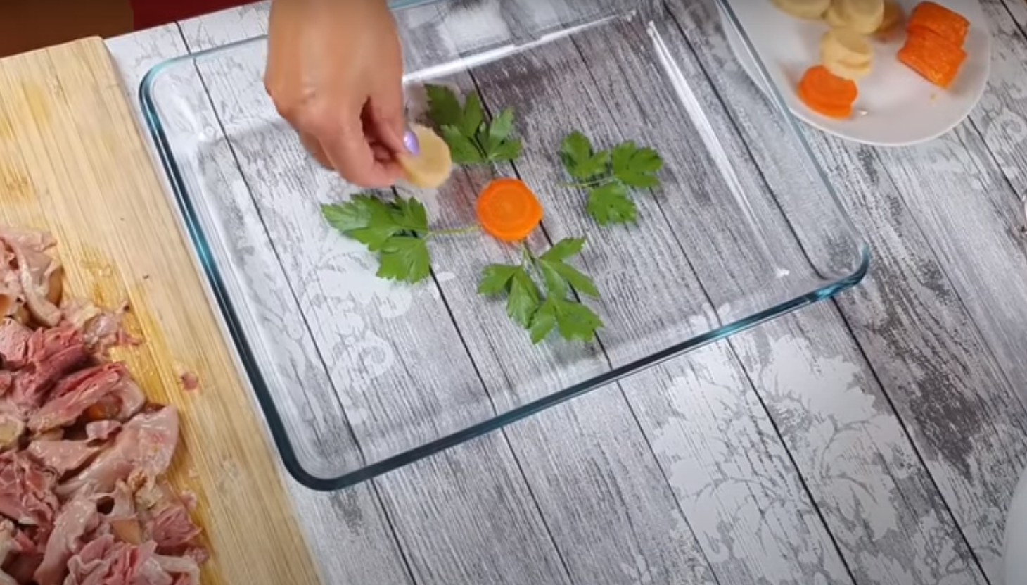 Mięso z golonek wieprzowych pokrój na drobne kawałeczki. Następnie pietruszkę i marchew pokrój na kawałki i ułóż na dnie przygotowanego naczynia wraz z natką pietruszki.