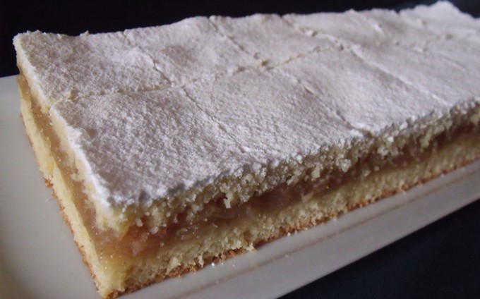 Pierwszą część położyć na spodzie blachy (24×36 cm), wyłożyć na nią masę z jabłek, a następnie przykryć drugą porcją ciasta, którą należy regularnie nakłuć widelcem. Wstawić do piekarnika rozgrzanego na 200 stopni i piec około 45 minut. Gdy ciasto ostygnie, polecam oprószyć je cukrem pudrem. To wszystko, smacznego!