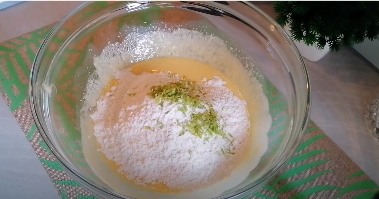 Następnie dodaj pozostałe sypkie produkty, czyli mąkę, proszek do pieczenia, skórkę z cytryny, sól.