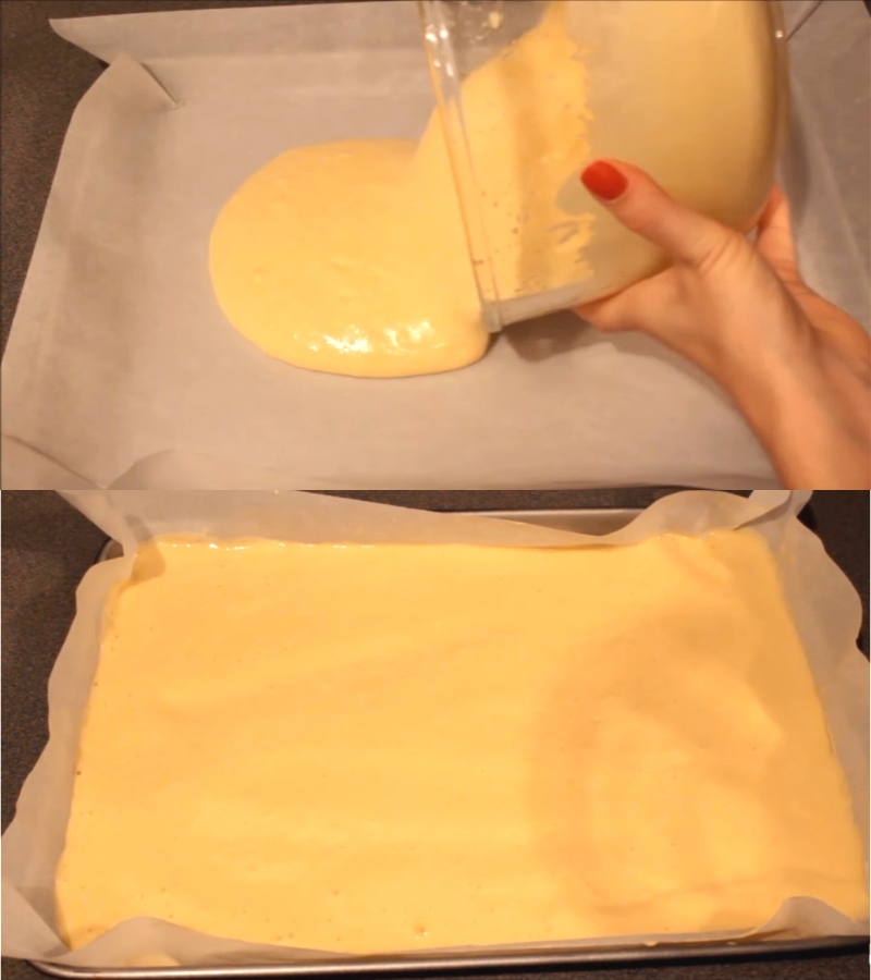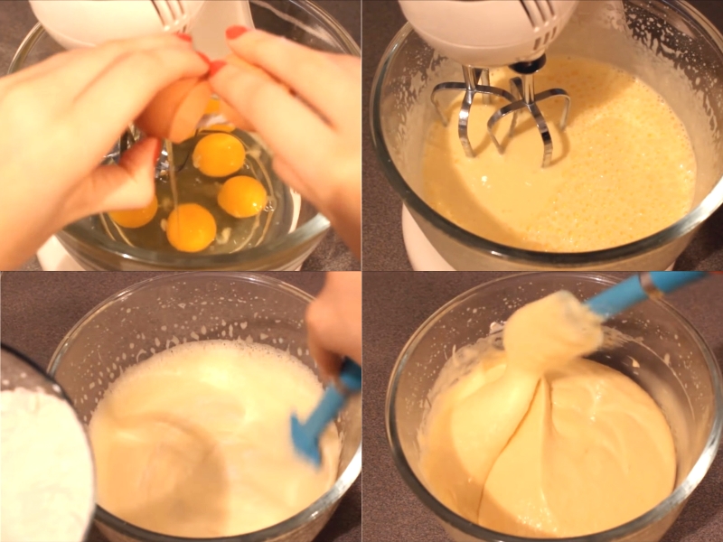 Do osobnej miski rozbij cztery jajka, kolejno dodaj gorącą wodę i ubij mikserem, do momentu aż pojawią się duże bąble. Następnie dodaj cukier i w ciągu dalszym mieszaj. Do mieszaniny dodaj mąkę i wymieszaj całość łyżką. Blachę do pieczenia posmaruj masłem i ułóż w niej papier do pieczenia. Do przygotowanej blaszki wlej ciasto i włóż do wcześniej rozgrzanego piekarnika, na 12 minut.