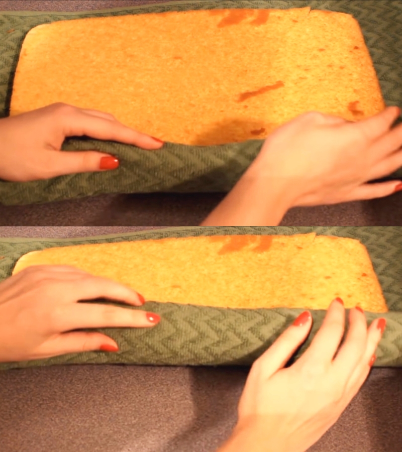 Gotowy biszkopt wyjmij z piekarnika na ręcznik lub silikonową matę, a następnie zwiń z ręcznikiem w luźny wałek. Ciasto pozostaw na parę minut, w celu ostygnięcia.