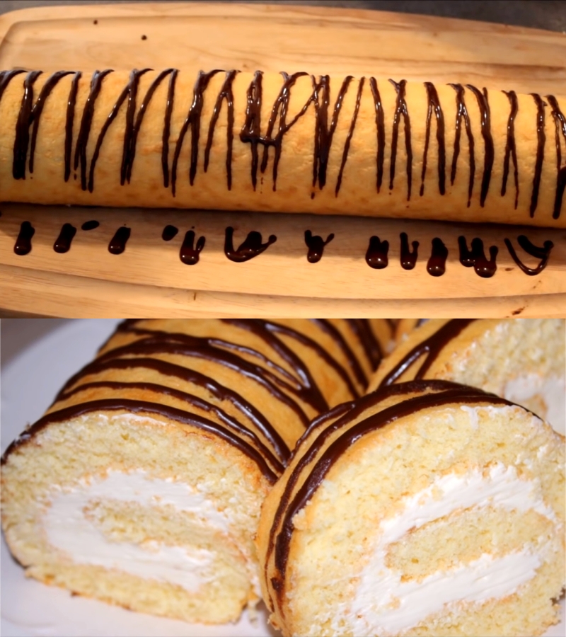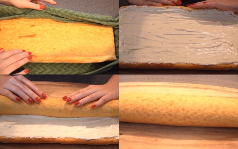 Ostudzone ciasto odwiń, delikatnie posmaruj masą i ponownie zawiń. Wałek z ciasta owiń folią spożywczą i wstaw do lodówki na dwie godziny.