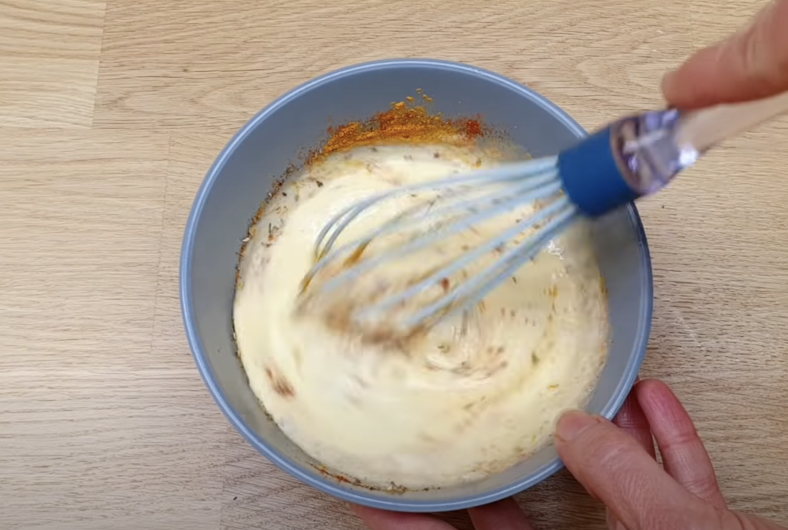 Wymieszać energicznie i dodać przyprawę gyros (ewentualnie suszoną paprykę lub przyprawę do kurczaka złocistego). Zalać kurczaka. Przykryć folią aluminiową i umieścić w rozgrzanym do 180 stopni piekarniku. Czas pieczenia: 40-50 minut.