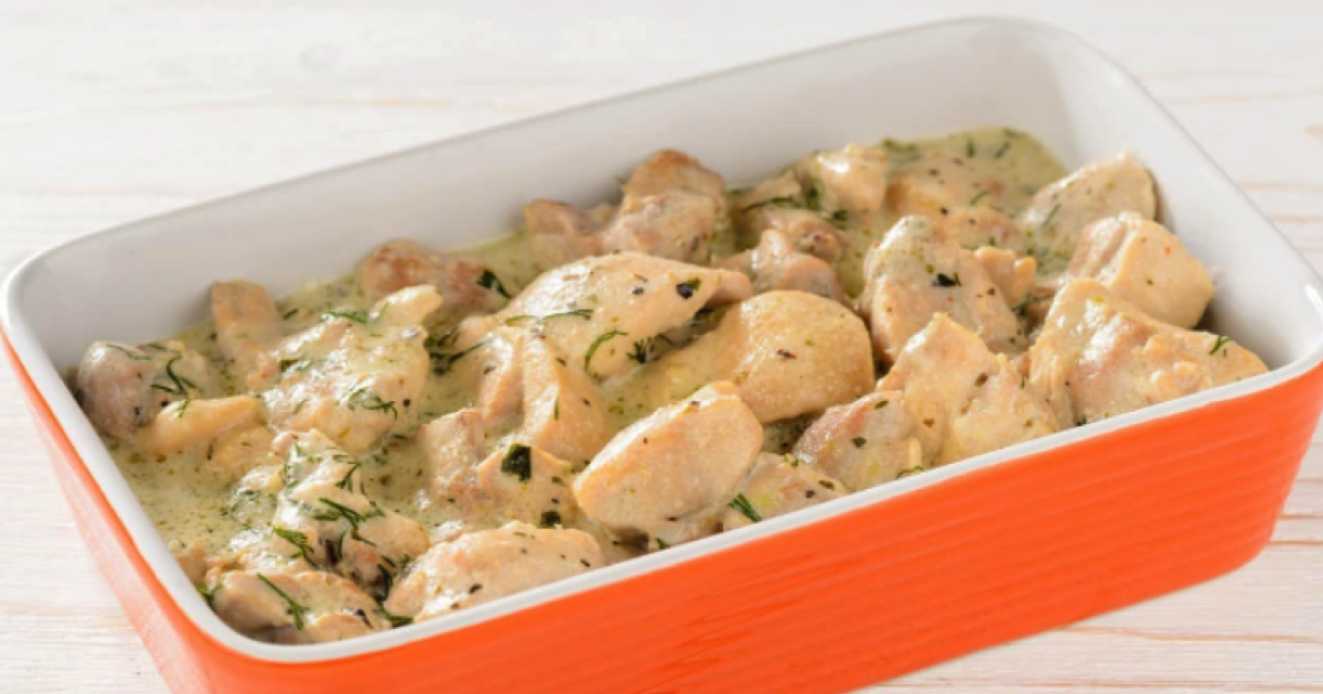 Umieścić kąski równomiernie w naczyniu żaroodpornym. Posypać suszonym koperkiem i rozmarynem. W następnej kolejności należy przygotować sos, w którym kurczak będzie zapiekany. Do miseczki wlać śmietankę, wcisnąć czosnek, dodać łyżkę musztardy (można więcej, jeśli ktoś lubi ostrzejszy smak).