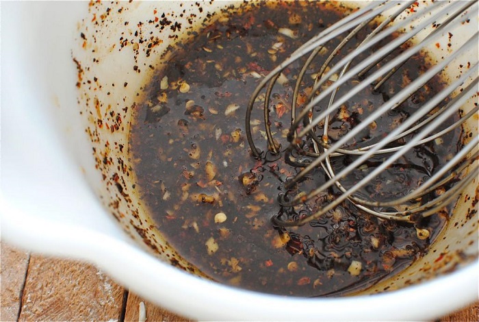 Wodę wymieszaj z oliwą z oliwek, octem balsamicznym i sokiem z cytryny. Dodaj odrobinę soli i cukier. Wymieszaj dokładnie kuchenną rózgą. Cebulę pokrój w piórka lub półplasterki.