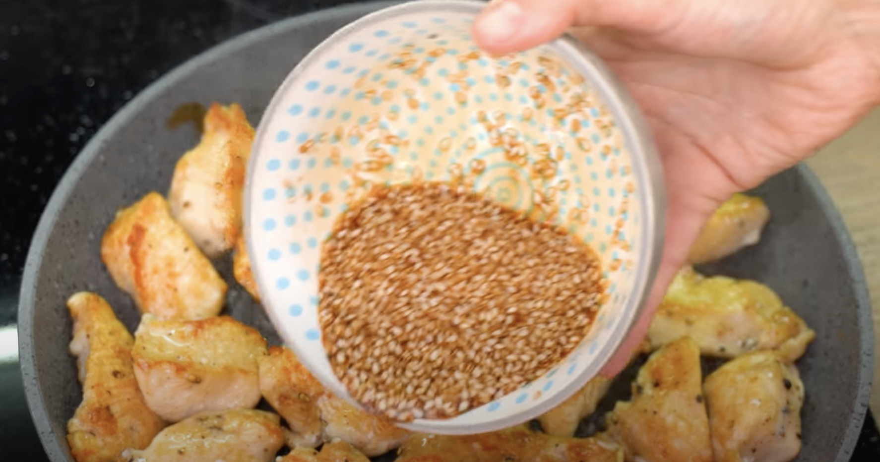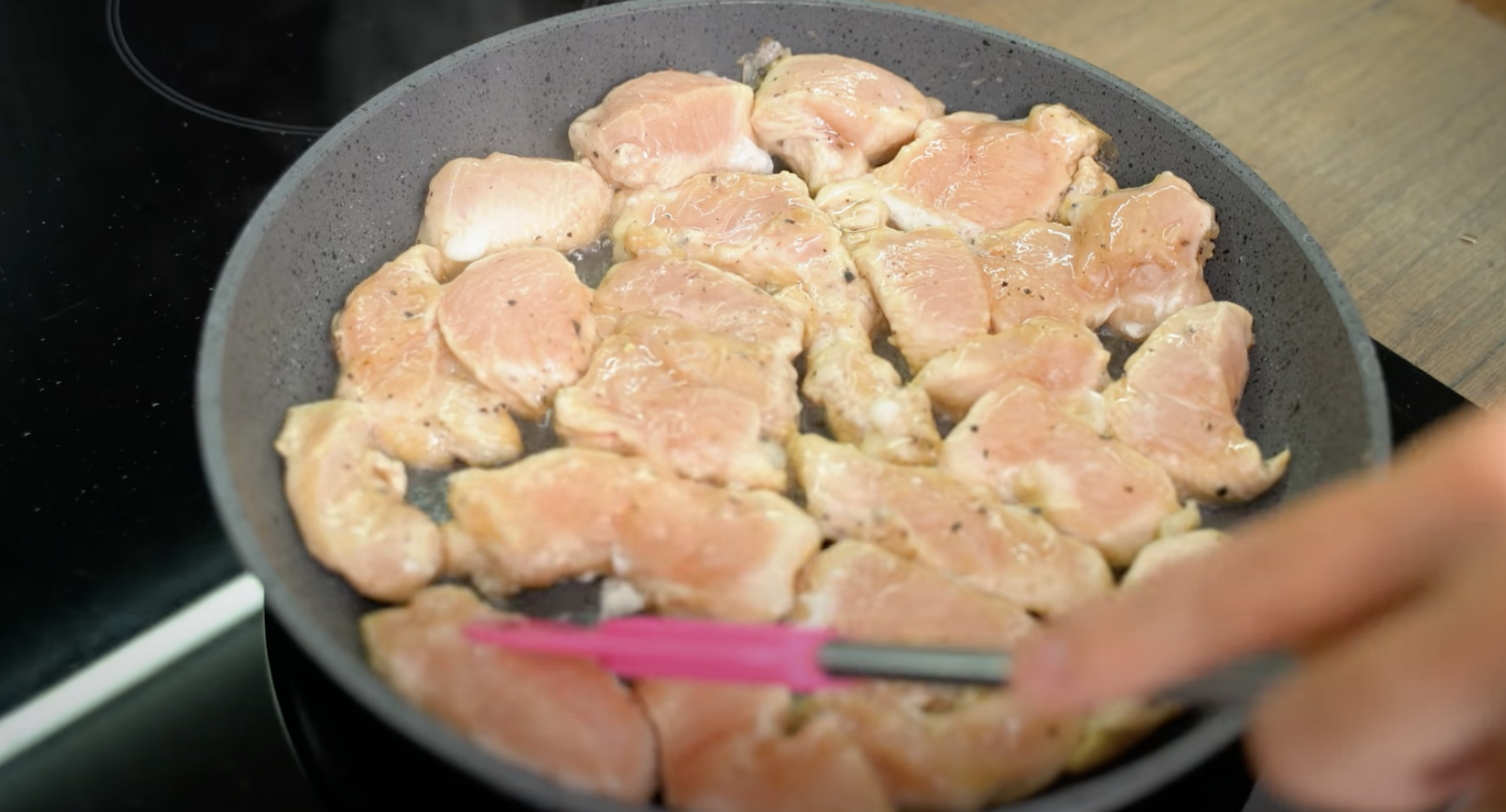 Na rozgrzanej patelni, rozgrzej olej. Smażyć kawałki kurczaka przez 2-3 minuty z każdej strony, aż będą złotobrązowe.