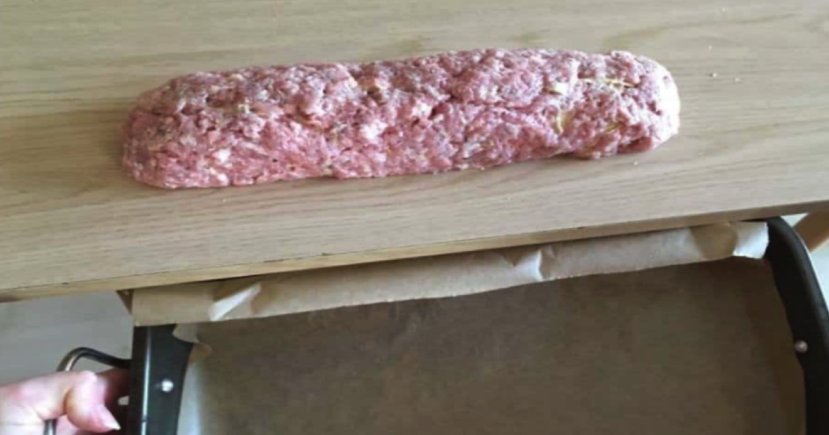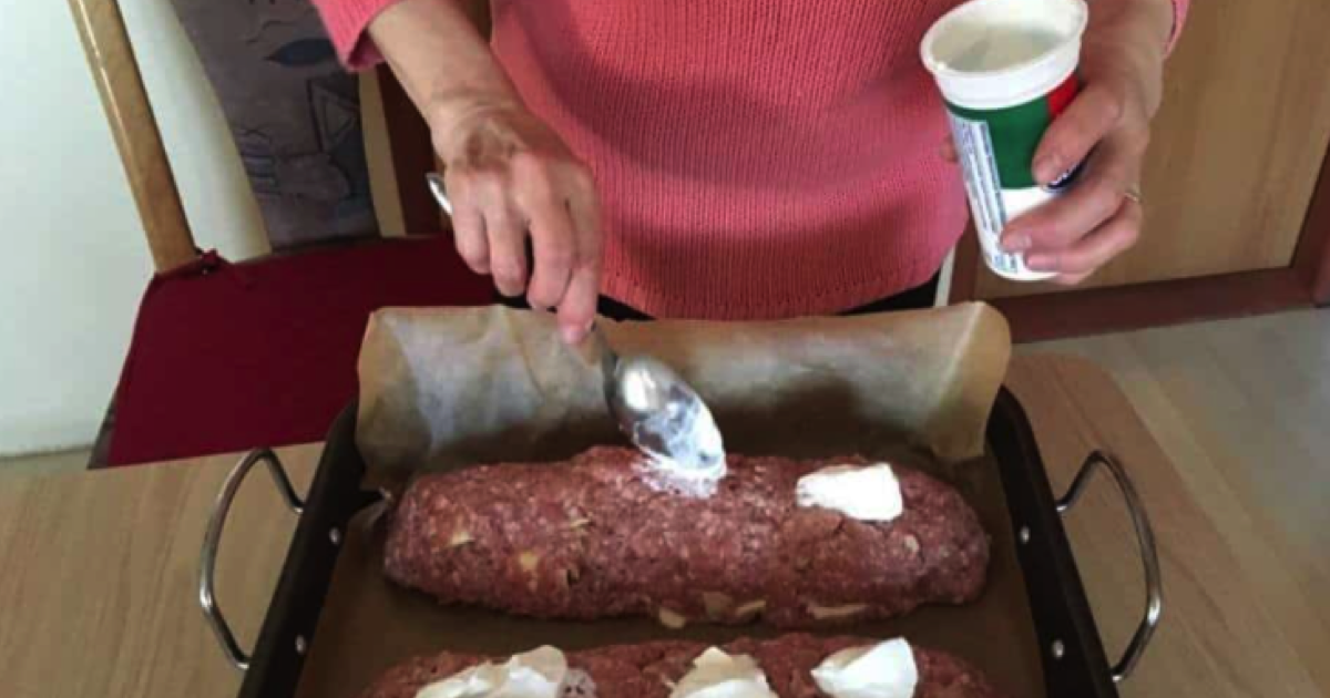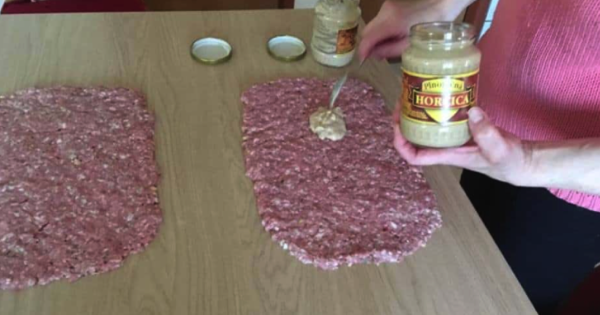 Następnego dnia mięso dzielimy na równe porcje. Można uformować dwa płaskie prostokątne placki. Każdy placek posmarować musztardą lub ketchupem, a następnie posypać startym serem.