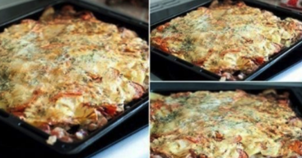 Na blaszce do pieczenia, posmarowanej olejem, układamy elementy warstwami: mięsko, cebulkę, ziemniaczki, pomidorki wysmarowane majonezem. Tak przygotowane danie wkładamy do rozgrzanego do 200 stopni pieca na około 45 minut.
