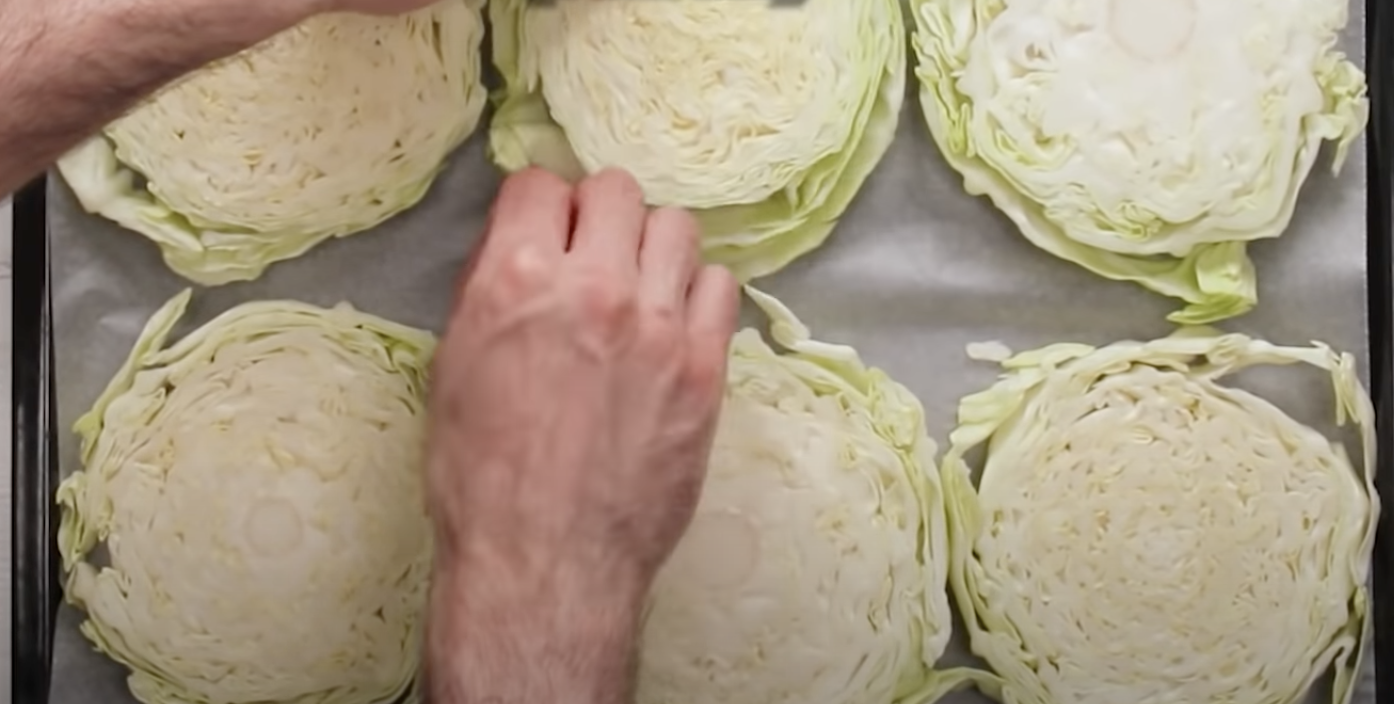 Plasterki kapusty ułożyć na blasze wyłożonej papierem do pieczenia.