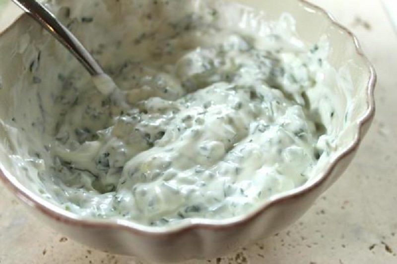 Wystarczy, że wymieszasz 250 ml gęstej śmietany, może być 12% lub 18% z przeciśniętym przez praskę lub posiekanym czosnkiem (ilość dowolna, zależy od Twoich upodobań) i niewielką ilością posiekanego koperku.