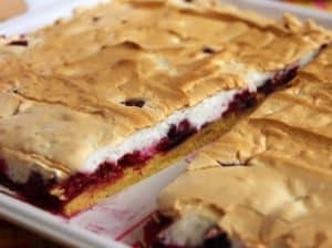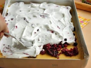 Upieczone wcześniej ciasto kroimy na pół, następnie jedną połowę umieszczamy na desce i jej górę przekładamy ostudzonym kremem budyniowym i przykrywamy drugą połową ciasta.
