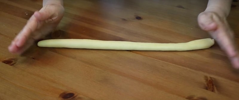 Ciasto musi zostać rozwałkowane na dość gruby walec, jednak trzeba pamiętać, aby na stole nie znajdowała się mąka.