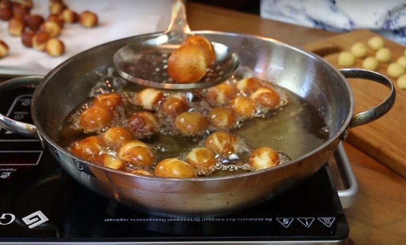 Do garnka należy wlać olej i podgrzać go. Pączki wrzucamy po jego zagotowaniu i smażymy na złoty kolor.