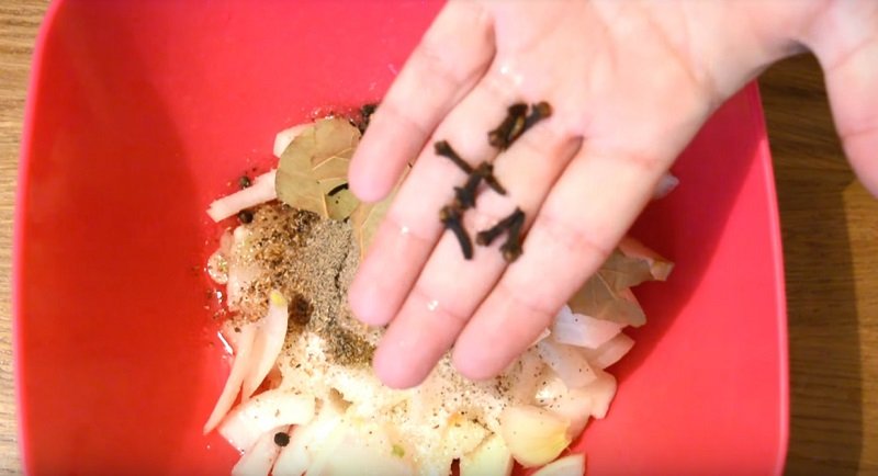 W tym czasie możesz przygotować marynatę. Aby ją wykonać wymieszaj ze sobą goździki, liście laurowe, pieprz, ziele angielskie, sól oraz cukier. Nie zapomnij o pokrojonym czosnku na cienkie plasterki oraz cebuli w kształcie pół pierścieni.