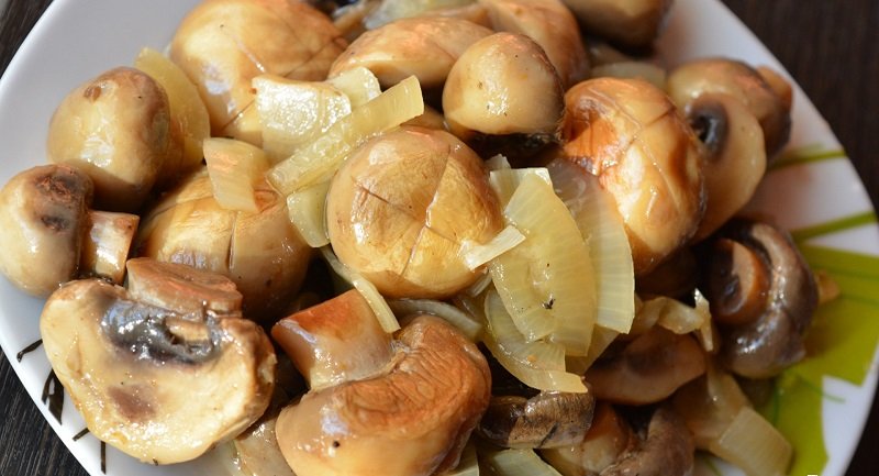 Na początku weź grzyby, dokładnie je umyj, a większe kawałki pokrój na 2-3 mniejsze. Duś na suchej patelni przez około 5 minut. Z pieczarek powinien się wytworzyć sok, który musi lekko wyparować.