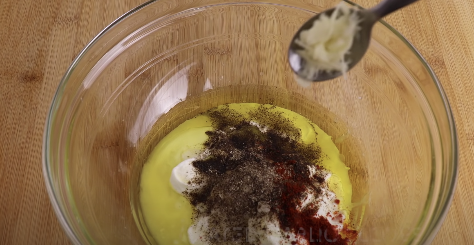 W misce połącz oliwę z jogurtem i musztardą. Dodaj przyprawy i przeciśnięty przez praskę czosnek.