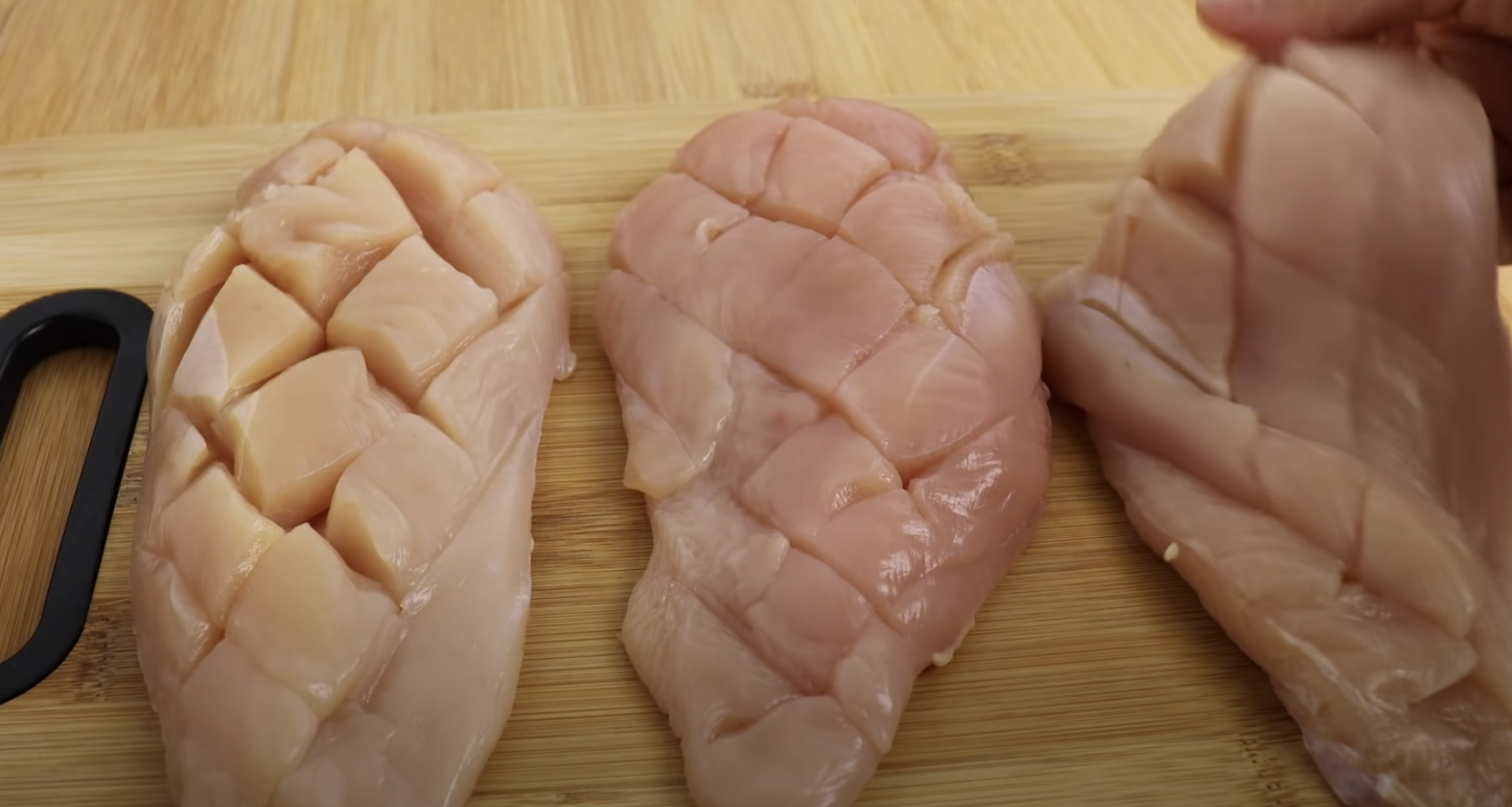 Ostrym nożem pokroić piersi kurczaka w kratkę.