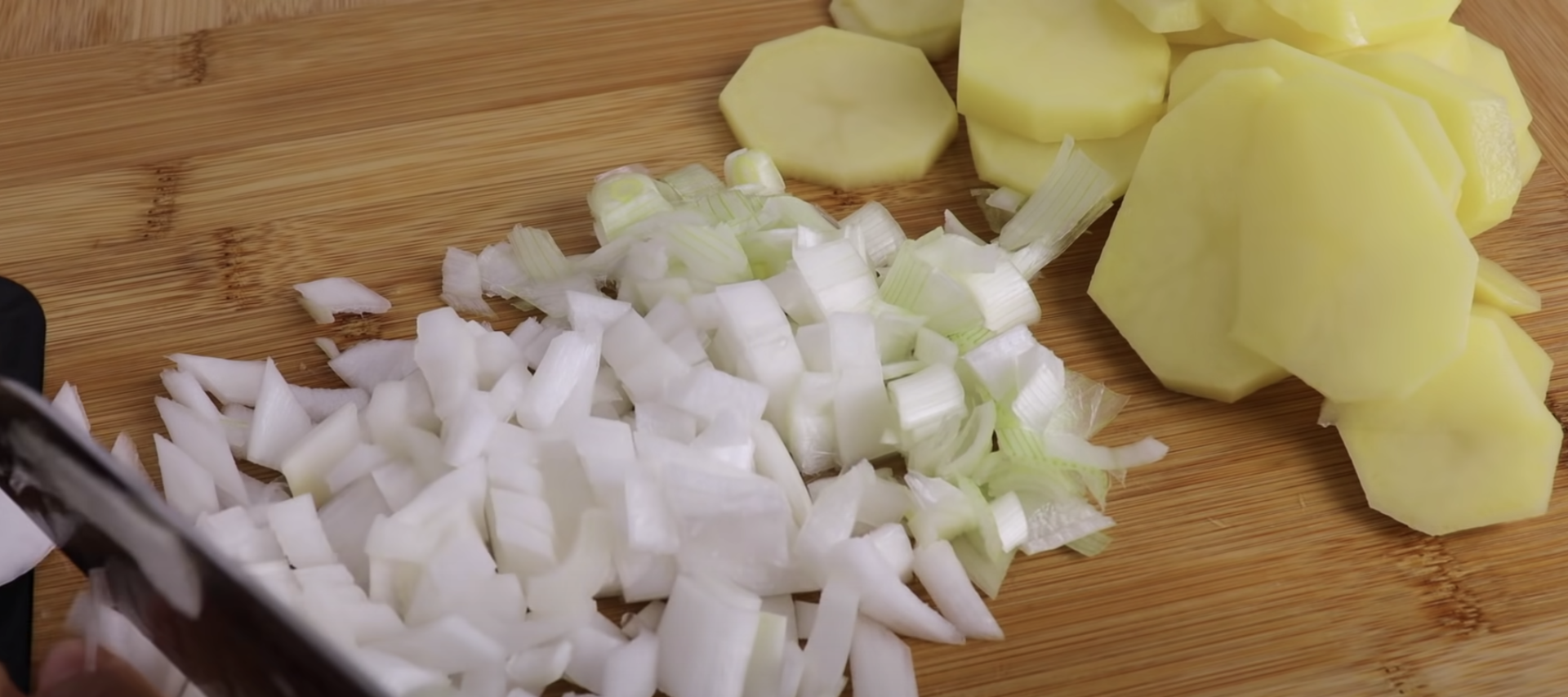 W tym czasie, gdy marynata i mięso się połączą, posiekaj cebulę i grzyby. Ziemniaki pokrój w plasterki. Umieść wszystkie warzywa na blasze do pieczenia.