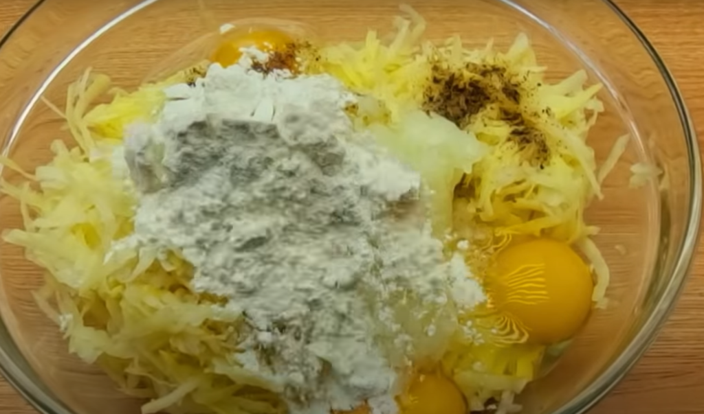 Ziemniaki odciśnij i umieść w suchej misce. Dodaj startą cebulę, 3 jajka, mąkę, pieprz i sól i wszystko bardzo dokładnie wymieszaj.